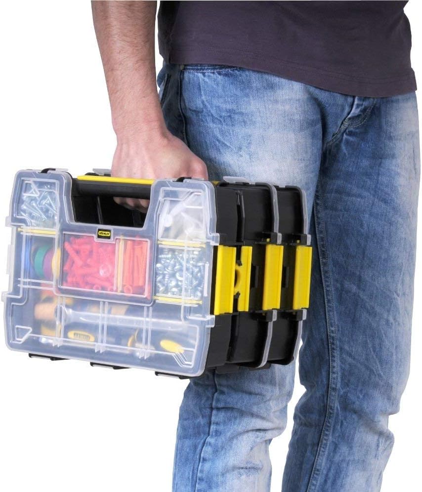 Organize your tools and supplies with ease using the Stanley Hand Tools STST14022. This 11.5" x 14.8" x 2.7" plastic utility box features a unique 90-degree angle design, allowing for comfortable storage of hammers, angled tools, and small parts together. With three compartments and eight removable dividers, you can customize the space to fit your specific needs. The interlocking design enables secure stacking and transport of up to three organizers at once, saving you time and space. The heavy-duty, impact-resistant plastic construction ensures durability, while the seal-tight lock jaw latching system secures all your items. The special lid structure interlocks with dividers to prevent small parts from moving between compartments. This Stanley tool box has a 5-pound capacity and is not water-resistant. It's available in a black and yellow color scheme.