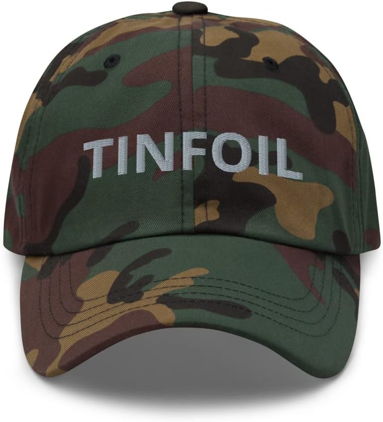 Protect yourself with your very own Tinfoil Hat! Dad hats aren't just for dads. This one's got a low profile with an adjustable strap and curved visor. 100% chino cotton twill Green Camo color is 35% chino cotton twill, 65% polyester Unstructured, 6-panel, low-profile 6 embroidered eyelets 3 ⅛” (7.6 cm) crown Adjustable strap with antique buckle Blank product sourced from Vietnam or Bangladesh