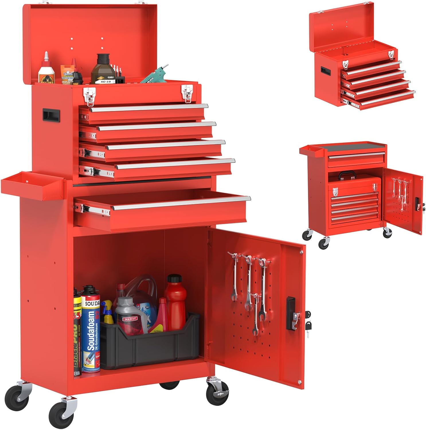 This 5-drawer rolling tool chest is the ideal companion for your garage, warehouse or workshop. It provides ample storage space for your tools. It also allows you to easily move the toolbox to access the tools you need whenever and wherever you need them. The sturdy metal construction ensures durability, while the secure locking system keeps your tools safe. Whether you're a professional or a DIY enthusiast, this tool box on wheels is not to be missed!