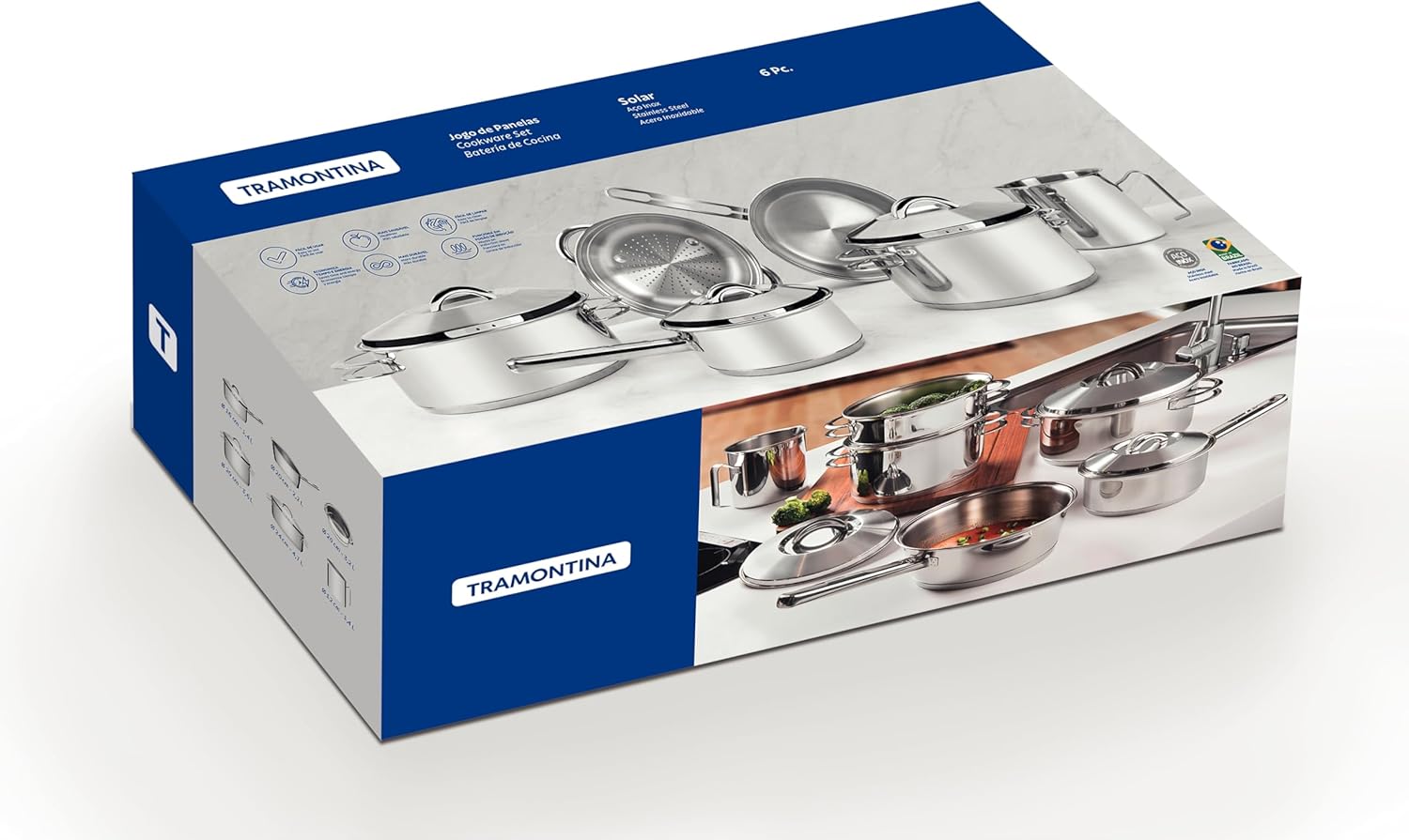 This versatile stainless steel cookware set from Tramontina offers durability and increased cooking performance at an affordable price. The triple layer base, which comprises a sandwich of stainless steel-aluminium-stainless steel, ensures even heat distribution and more efficient cooking and is suitable for all hob types including induction. Comfortable stainless steel handles feature across the collection on both the lids and bodies. All items are dishwasher safe and can also be used in the oven (up to 260°C).