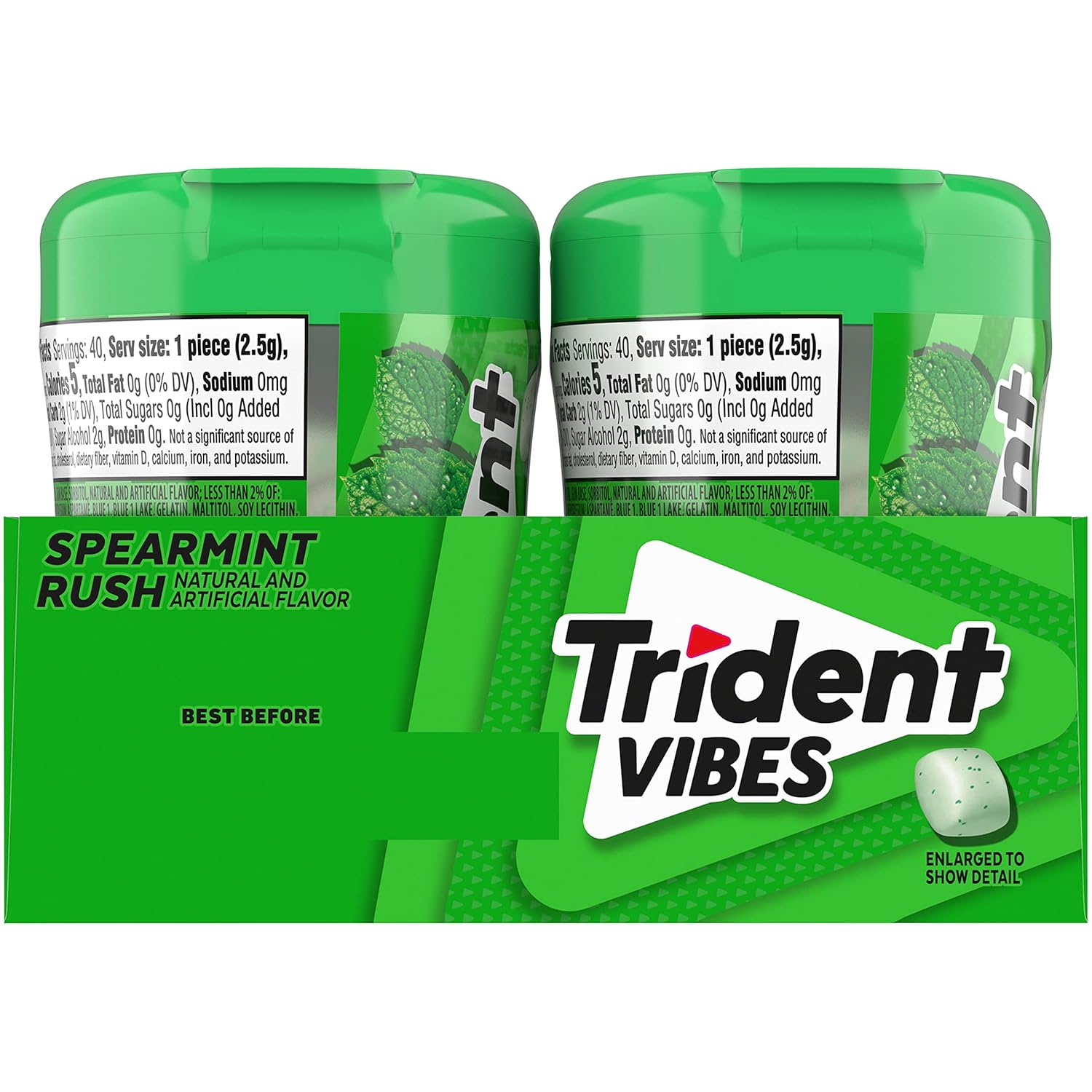 Trident Vibes Spearmint Rush Sugar Free Gum gives your mouth a burst of something new. Each square piece of this sugarless gum has 35% fewer calories than sugared gum and is coated with a crunchy candy-like shell that’s loaded with sweet crystals. Each bite of Trident Vibes gum gives way to a smooth, effortless chew that has surprising pops of juicy spearmint for bold flavor. Packaged in convenient bottles, this sugar free chewing gum stays fresh and ready to pop into your mouth wherever you go. Keep a bottle of this spearmint gum in your desk, purse, car or anywhere else you might need extra fresh breath fast. Bulk gum packs give you plenty of Trident spearmint gum to share at home or the office.