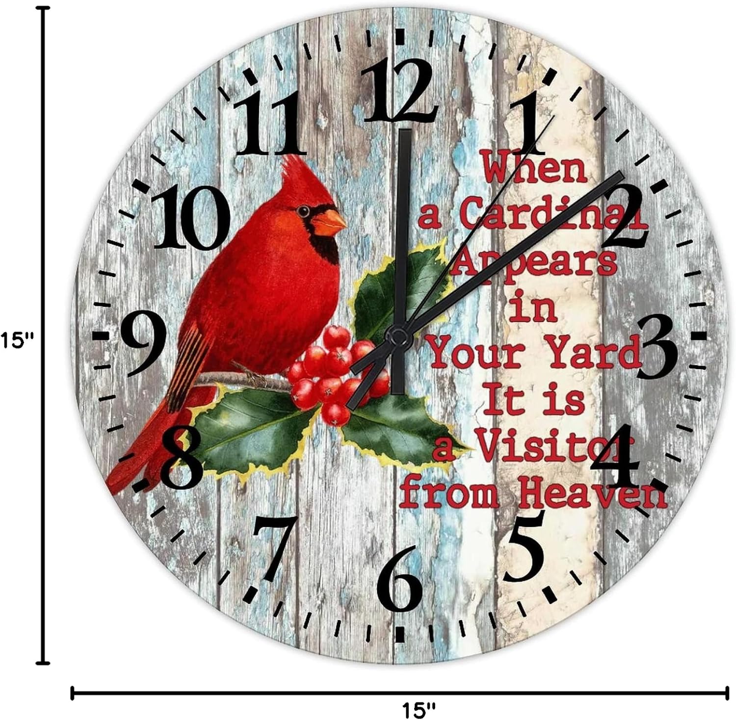 When A Cardinal Appears in Your Yard Its A Visitor from Heaven small wall clock Cardinal Angels are Near Floral Red Kitchen Wall Clock Battery Operated Quartz Analog Quiet Arabic Numbers Clock Living Room Bedroom Kitchen Farmhouse Decor 15 Inch??Details:Product Size: 10/12/15 inches, (25/30/38 cm)Shape:RoundMaterial: Wood??Functional Home DécorThis Sympathy Gifts for Families Friends clock aren't just for timekeeping. They function as beautiful wall decor pieces, beyond telling time, and bring both style and purpose to any room.A charming home decoration, very suitable as a housewarming gift, making the home more warm. Suitable for any room, you can put it in any room such as home, living room, master bedroom, kitchen, bathroom, home office, etc. Elegant, durable and stylish.??Clock Hands Troubleshooting Guide:Check that the battery is a new battery and not a used battery.Make sure the hour and minute hands are not crossing or touching each other. If they are, adjust the hands by slightly bending them.See if the center pin that holds the hands together is firmly pushed in or screwed on, depending on the style.If hands are still not moving after the above, please reference the hands replacement instructions included with all of our open face clocks.