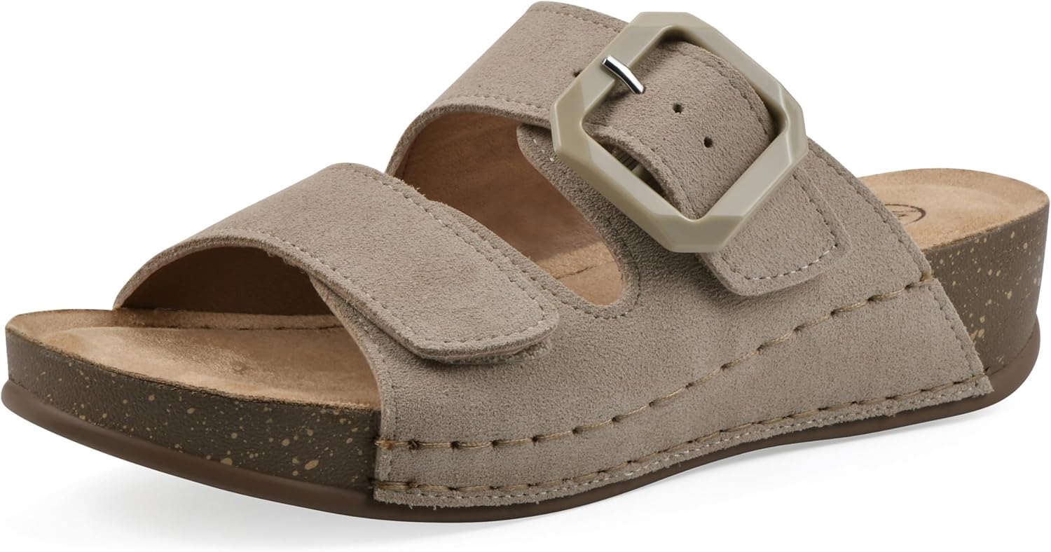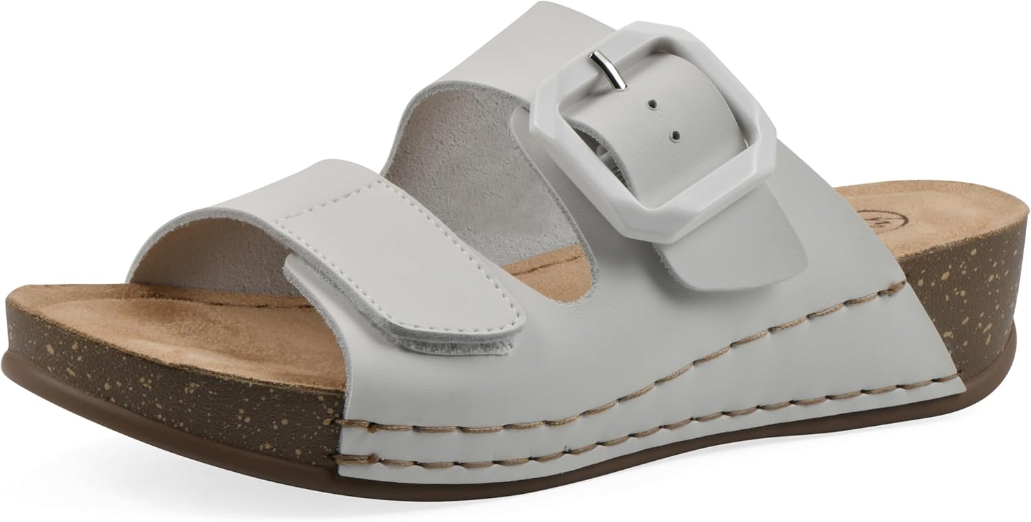 The Fearful wedge sandal from White Mountain Shoes will elevate your style. The contoured cork-like outsole features a cushiony footbed, designed with comfort in mind. Two bands are adjustable for a custom fit. The back strap has a modern buckle, and the front strap has a Velcro closure. The easy slip-on design is perfect for the woman who is on the go. You will not be fearful in the Fearful wedge slide sandal!