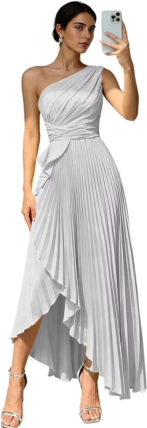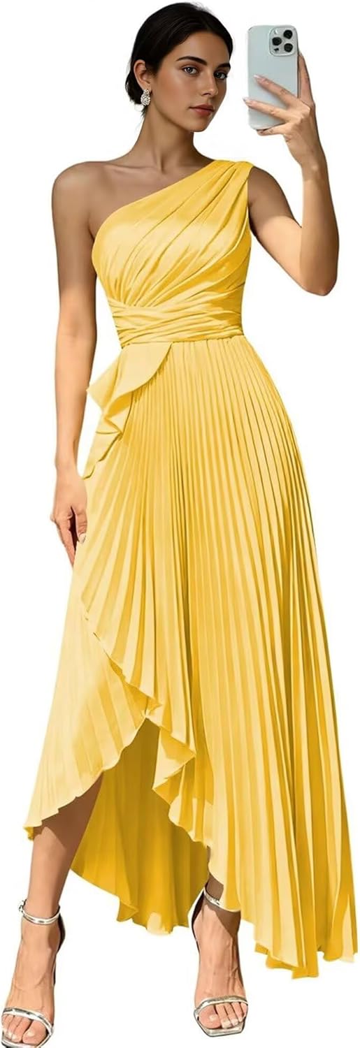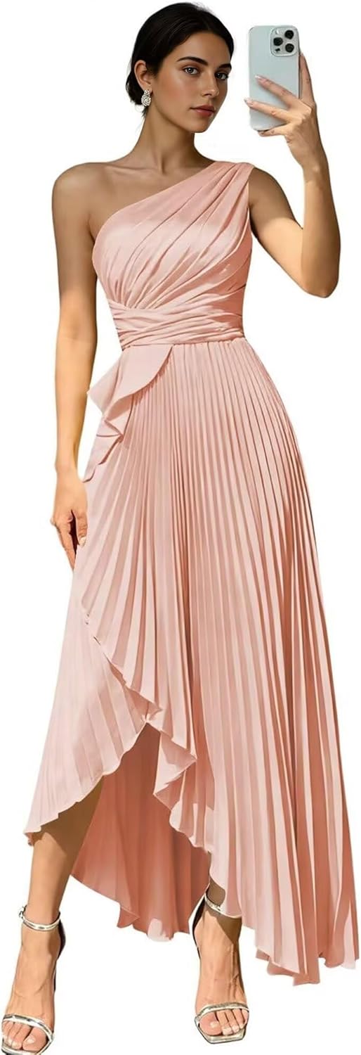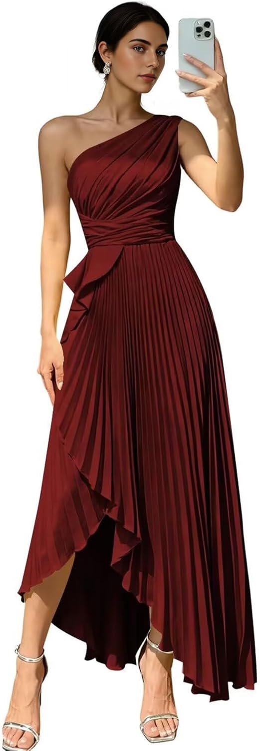 Make a dramatic entrance in this exquisite one shoulder satin bridesmaid dress that combines modern elegance with timeless sophistication. The stunning one shoulder design creates an asymmetrical neckline that beautifully showcases your collarbone and shoulders, while the elegant pleated detailing adds texture and dimension to the overall look. Crafted from premium quality satin, this maxi length gown features a luxurious sheen and flawless drape that will make you feel like a celebrity on your special night.The sophisticated pleated bodice creates beautiful visual interest while enhancing your natural curves. The flowing maxi length design gracefully skims the body, creating an elegant silhouette that is both flattering and comfortable. The A-line cut ensures a universally appealing fit that works beautifully for all body types, including plus size bridesmaid dresses. The luxurious satin fabric moves with you, creating a beautiful flow that is perfect for dancing and celebrating throughout the evening.This stunning satin bridesmaid dress is available in a rich palette of colors including deep burgundy bridesmaid dresses, classic navy blue bridesmaid dress options, and vibrant emerald green bridesmaid dress variations. Each color option is carefully selected to complement various skin tones and wedding color schemes. The hidden back zipper ensures a smooth, seamless fit while the fully lined interior with boned bodice provides exceptional support and shape retention.The adjustable one shoulder strap allows for a customized fit that flatters your unique figure. Whether you're attending a high school prom, serving as a bridesmaid in a formal wedding, or attending an elegant gala event, this satin gown will ensure you make a lasting impression.Experience the exceptional quality and stunning beauty of this satin bridesmaid dress that will make you feel confident and radiant on your most important occasions.