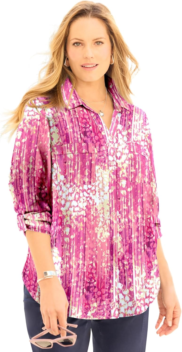We combined the clean lines of a classic cotton utility shirt with the excitement of color and print. The result? Everyday comfort with a dash of fashion. Button it up or layer it over our Suprema Cami With Lace. It's a versatile look to pair with your favorite jeans or casual pants. FABRIC: Designed with crisp cotton poplin, a fabric loved for its breathability and classic look and feel. FIT: Relaxed and easy shape with shirt collar, V-neckline and classic utility details. Buttonfront. Chest pockets. Convertible long sleeves that roll to 3/4 sleeves via button tabs. 100% Cottonbr>Machine Washbr>Imported Plus Size Topbr>Front Length: Regular 31”, Petite 29" br>Plus Sizes 0X–6X, Petite Plus Sizes 0XWP–3XWPbr>Catherines