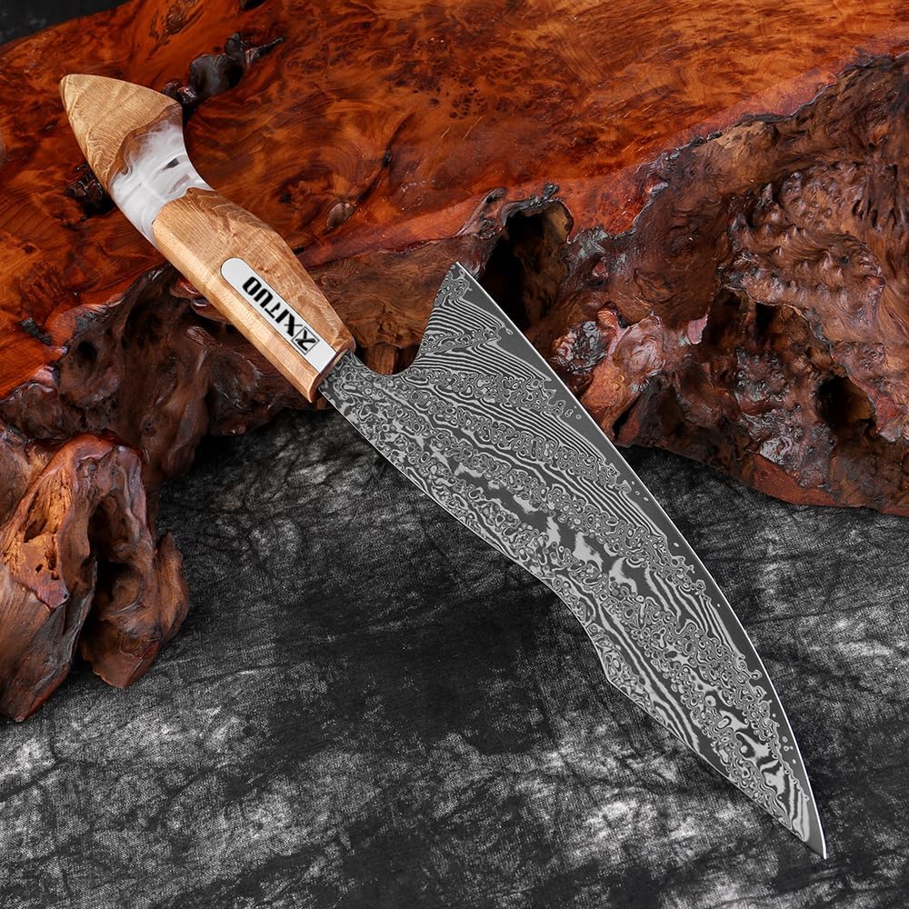 Experience precision cutting with this stunning 7-inch Nakiri knife from XITUO. Crafted with Damascus steel, this professional Japanese-style chef knife features an exquisite wave pattern that's not just beautiful, but functional. The razor-sharp blade is perfect for precise vegetable preparation, offering clean, smooth cuts every time. The high-carbon steel construction ensures exceptional edge retention and durability. The ergonomic wooden handle provides a comfortable, secure grip while maintaining perfect balance. This versatile kitchen knife combines traditional Japanese craftsmanship with modern design elements, making it an essential tool for both home cooks and professional chefs. The substantial blade allows for efficient chopping, slicing, and dicing of vegetables with minimal effort. Each knife showcases a unique Damascus pattern, making it both a functional kitchen tool and an artistic addition to your cutlery collection. The traditional Nakiri design, with its straight edge and squared-off tip, is specifically optimized for vegetable preparation, allowing for clean cuts from heel to tip.